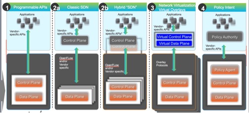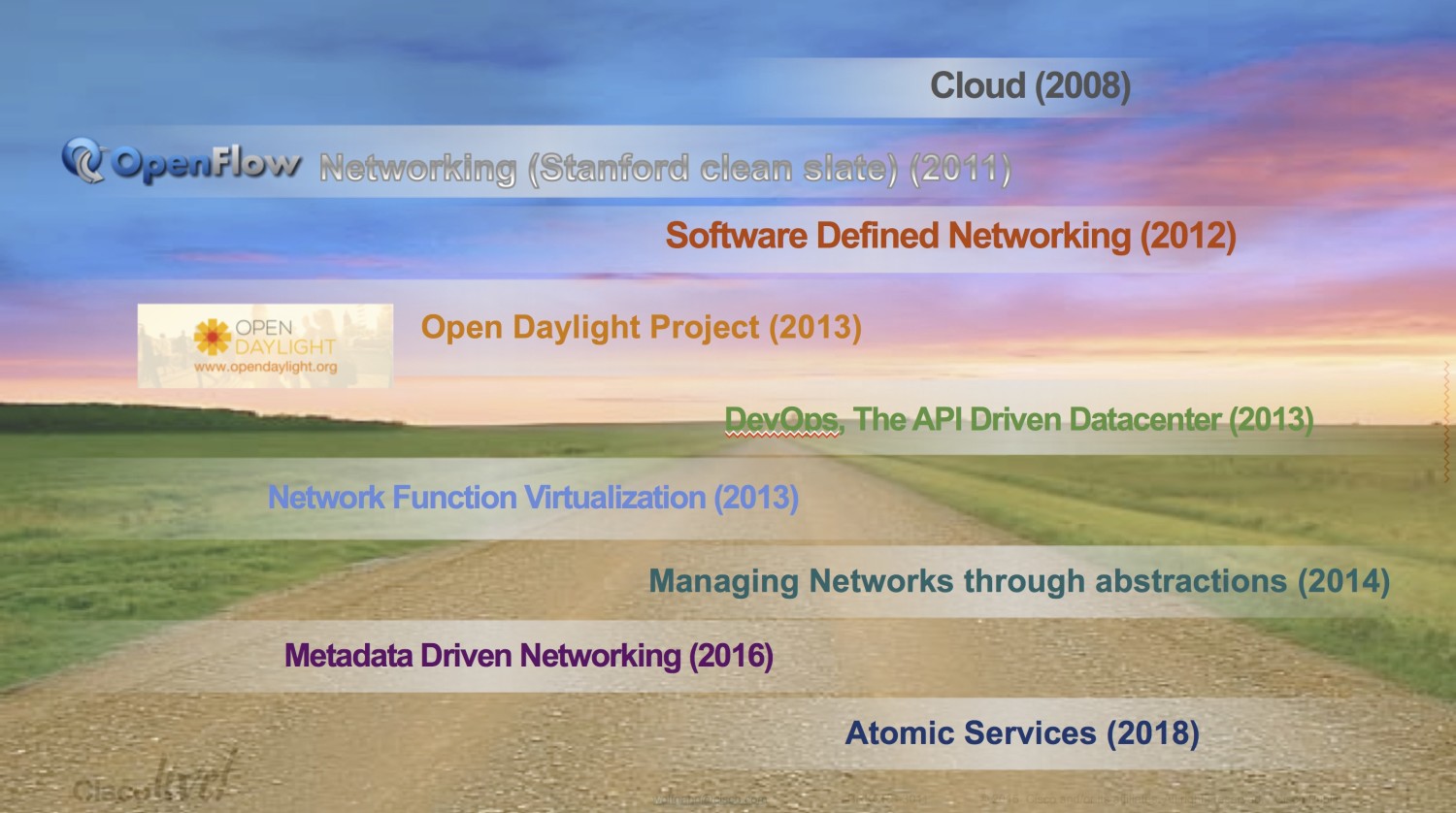 During this journey we faced different approaches on Network Programmability Models. We started with vendor specific API or simple CLI/SNMP, Classic OpenFlow based SDN, Hybrid SDN based on “ships in the night” or “integrated mode”, Network Virtualization with Virtual Overlays to finally arrive at “policy intent” or also described as “Managing Networks through abstractions”.